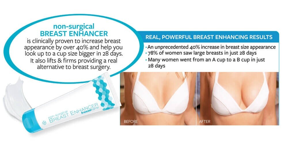 freezeframe non surgical breast enhancer is clinically proven to increase the appearance of breasts in as little as 28 days. Not only that, but the clinical trials showed significant lifting and firming of the breast tissue. This provides women with an alternative to surgery and hormone treatments, with which they can both safely, and economically boost their bust, and their confidence.