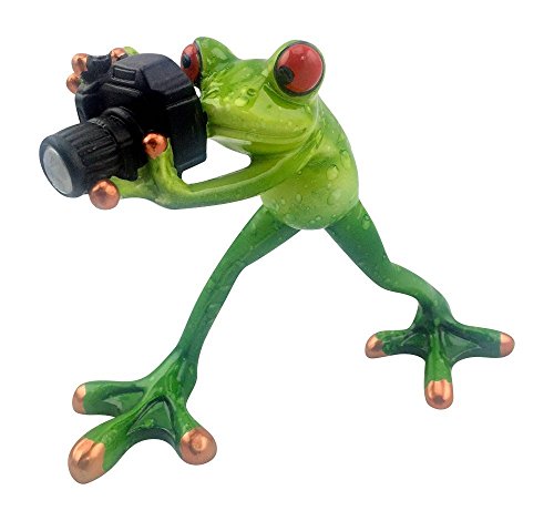 - Figurine is glossy green with copper toes and holding a black camera