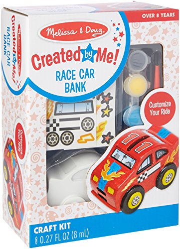 Studio : Melissa Doug Publisher : Melissa Doug Binding : Toy Product Description Race to save your change with this cool race car bank! Everything you need is included: 36 stickers, 6 pots of paint and an easy-to-clean paintbrush. Resin bank measures approximately 2.25" high 0