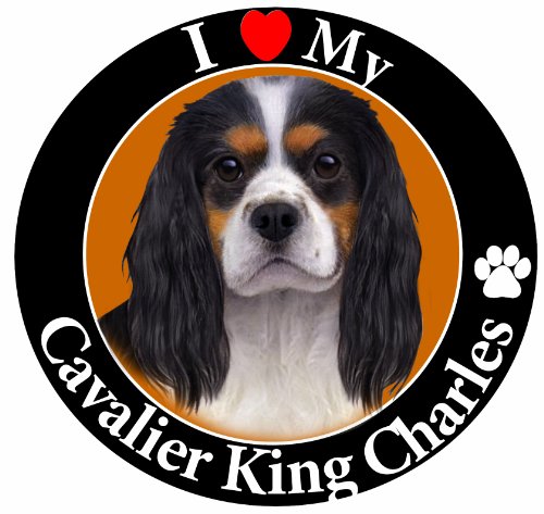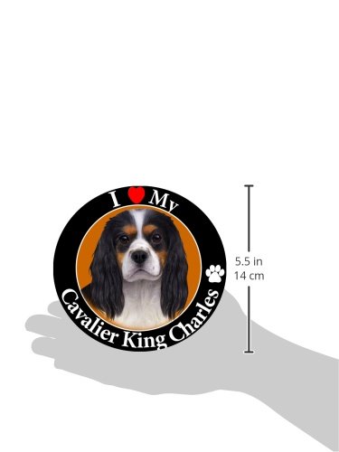 "I Love My King Charles Cavalier (Tri Color)" Car Magnet With Realistic Looking King Charles Cavalier Photograph In The Center Covered In UV Gloss For Weather and Fading Protection Circle Shaped Magnet Measures 5.25 Inches Diameter