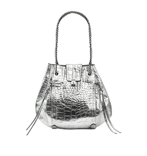 -. Feature : Dimensions: 12"L x 10"H x 5"W / Handle Drop: 19.50" / Color: Silver / Croc embossed leather mid-size bucket hobo is functional and sleek. Pull chain accordion construction opens wide to permit easy access / Top placket lock closure secures contents with a simple "click". Discreet hardware allows the richness of the polished leather to prevail