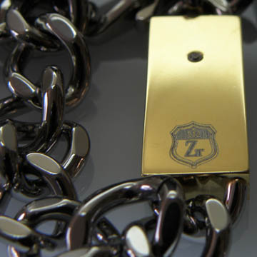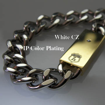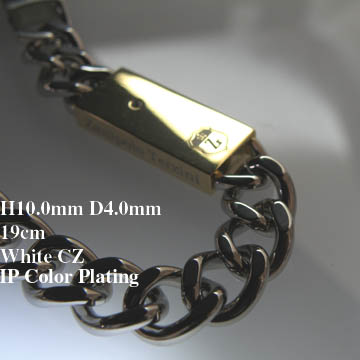 ホワイトジルコニアがワンポイントのゴールドコーティングプレートのTOP がついたチェーンブレスです。見た目は重量感たっぷりの存在感大なデザイン☆でもステンレスは凄く軽い素材なので邪魔のならず違和感なくお使いいただけます!!