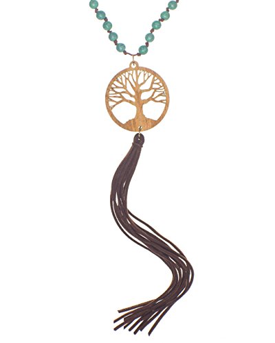 A long rosary blue beaded necklace and earring set with a wooden tree of life medallion cut out pendant finished with a dangling faux leather tassle by Jewelry Nexus Jewelry Nexus is dedicated to introducing jewelry that fits the lifestyle of today's woman. Quality product and first-class customer service have contributed to our reputation. Jewelry Care Instructions: Don't wear your jewelry to bed. Please store your jewelry in a protective container and keep away from sunlight and moisture. For mild cleaning please use a Silver Polishing Cloth.Feature
