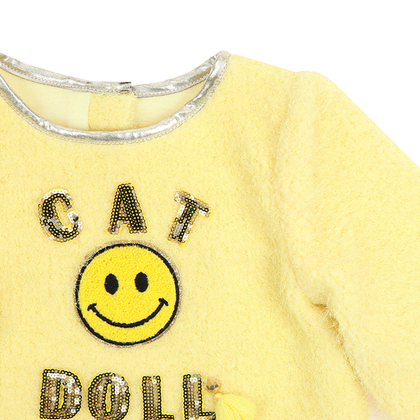 상품설명 살짝 롱한 기장감의 옐로 캣돌 뽀글이 탑입니다. 전체 안감이 얇게 들어가져 있어서 보온성이 뛰어난데요. 네크라인을 따라 들어간 골드배색과 블링블링한 캣돌 스팽글 로고 포인트와 부클 스마일 자수로 포인트를 주었습니다.