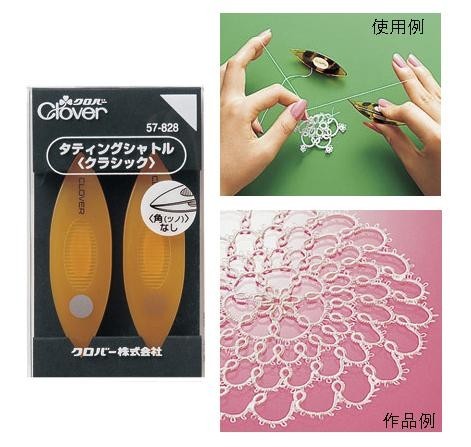 基本の結び目とピコットの作り方、つなぎ方を覚えれば、あとは応用で自由に作品がつくれます。べっ甲調の素材を使用した、角(つの)のないシンプルな形状のシャトルです。