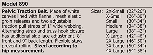 -. Feature : Pelvic Traction Belt / White canvas lined with flannel / Strap and truss-hook closure / This listing is for pelvic belt only... spreader bar and rope are NOT included. / Sizes: 2X-Small, X-Small, Small, Medium, Large, X-Large, 2X-Large, 3X-Large, 4X-Large