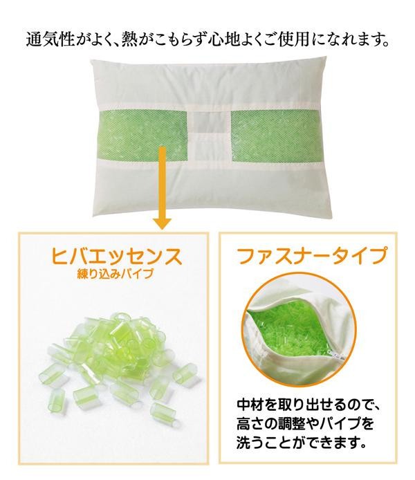 ヒバエッセンス練り込みパイプを使用した枕です。パイプ使用のため、通気性がよく、熱がこもらず心地よくご使用できます。ファスナー式で中材(パイプ)の交換、高さ(量)の調節が可能です。ご家庭で簡単にパイプが洗えます。 |