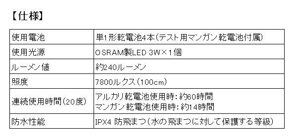 fk094igrjsいざというときに便利ですすぐに使える電池付き サイズ 最大径:約114×長さ200mm 個装サイズ:13×33×12cm 重量 約270g(電池別) 個装重量:667g 素材・材質 ABS樹脂 製造国 中国 広域を明るく照らす強力ライト いざというときに便利ですすぐに使える電池付き