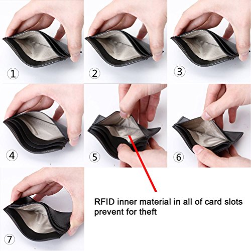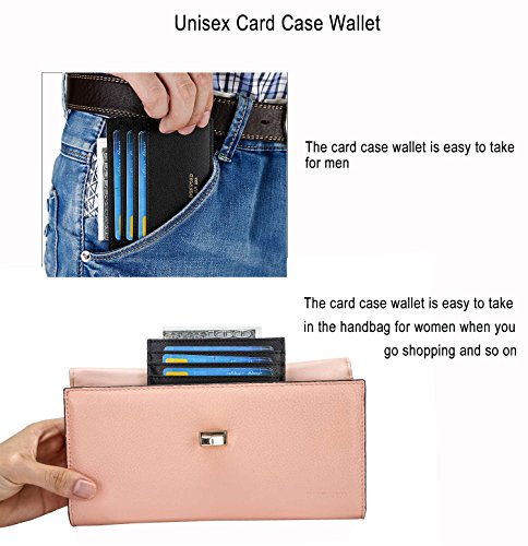 -. Feature : ULTRA SLIM CARD CASE WALLET. The leather card holder is designed to be slim and feels amazingly soft. Sturdy enough to last a long time, its super slim figure (only 0.2 cm/0.08 inches thickness) makes it easy to slide into your front pocket. It is super thin, fits perfect in your pocket and can hold at least 6 cards and some folded cash comfortably. / MADE FROM COWHIDE PREMIUM LEATHER. This super thin card sleeve is made from premium cowhide leather, durable and stylish. Comfortable to use. Great slim card sleeve wallet for carrying your most frequently used cards and some bills. / LEATHER RFID SLIM WALLET - RFID is the use of radio waves between devices to transfer data. Credit cards, payment cards, and driver's licenses all use RFID. WHY USE A RFID WALLET? - Personal information on these cards is vulnerable to theft by pickpockets using RFID scanners unless you have the special linings provided by a RFID blocking wallet. / MINIMALIST WALLET DESIGNED FOR PRACTICALITY. The slim card case wallet is light in weight (0.7oz only), perfect for a night out tucked away almost invisibly in your pocket and it won't look like that you bring a brick when you are bringing all the necessary. Professional for business cards or a small wallet which carry the cards you often use.there are 6 card slots on both sides. a middle compartment where you can put notes, coin,receipts or some folded cash. / GREAT COLOR SELECTION. It is just the card case wallet you will need in your daily life without being that fancy, we offer several colors for you to choose from, no matter you are an elegant lady or a gentleman, you will find the right color to fit your style. Whether you wear jeans, shorts, or slacks, it fits perfectly in front or back pocket without being noticed. Ideal gift for your family members and friends.