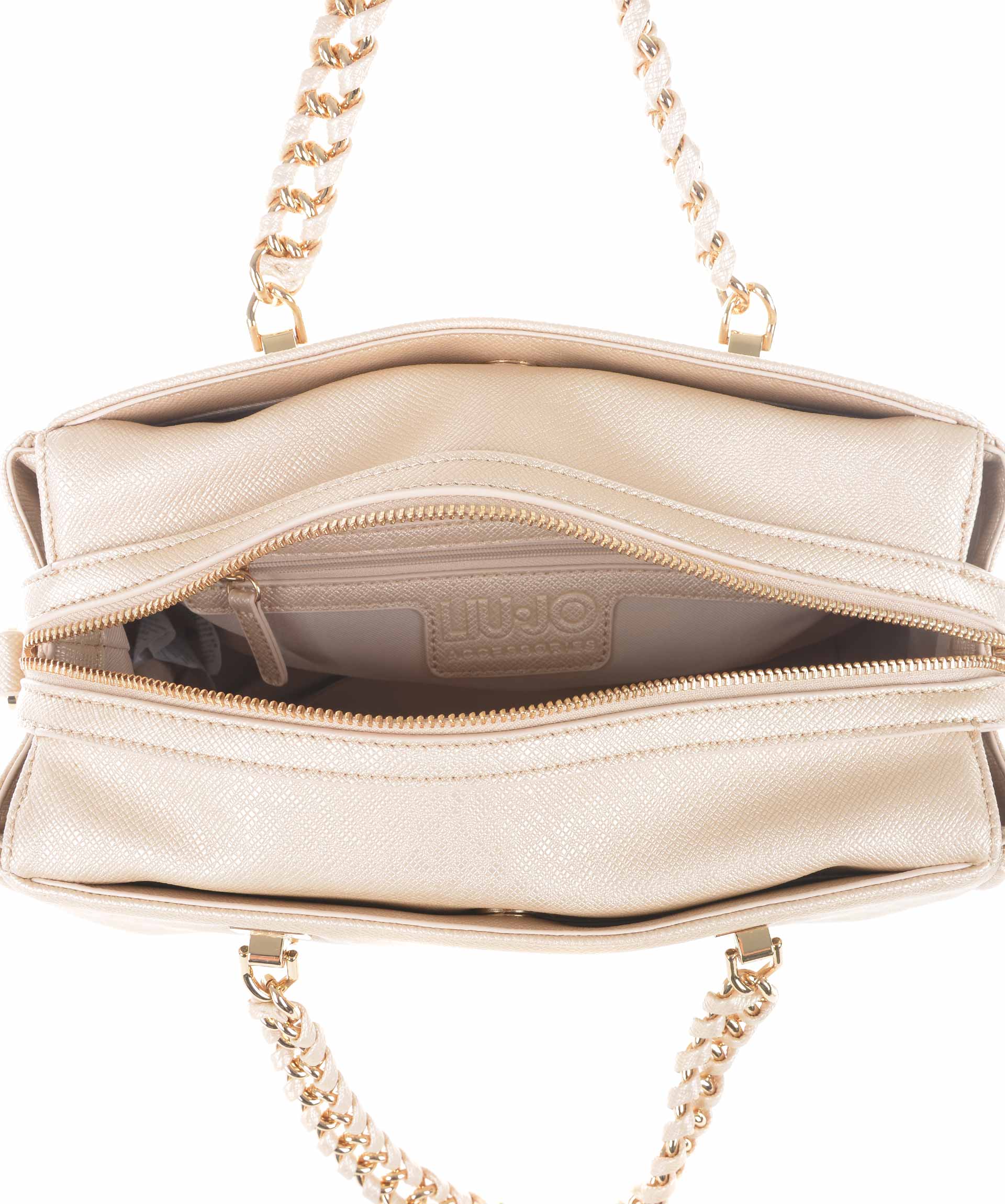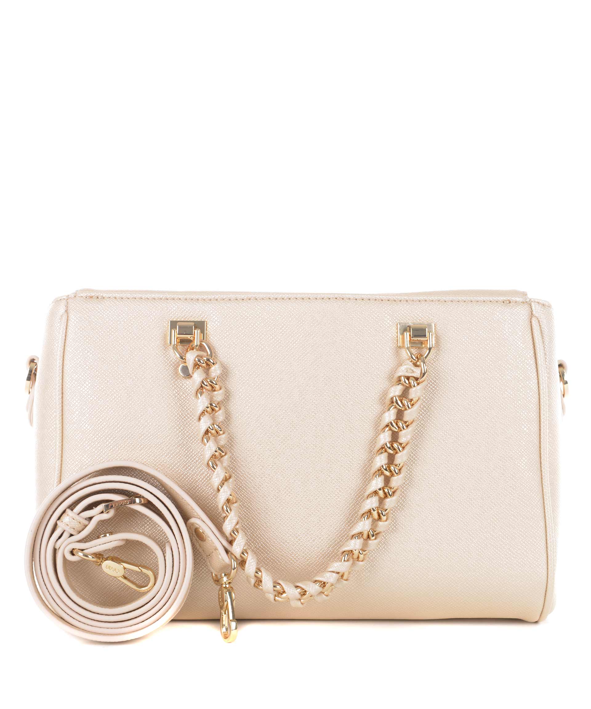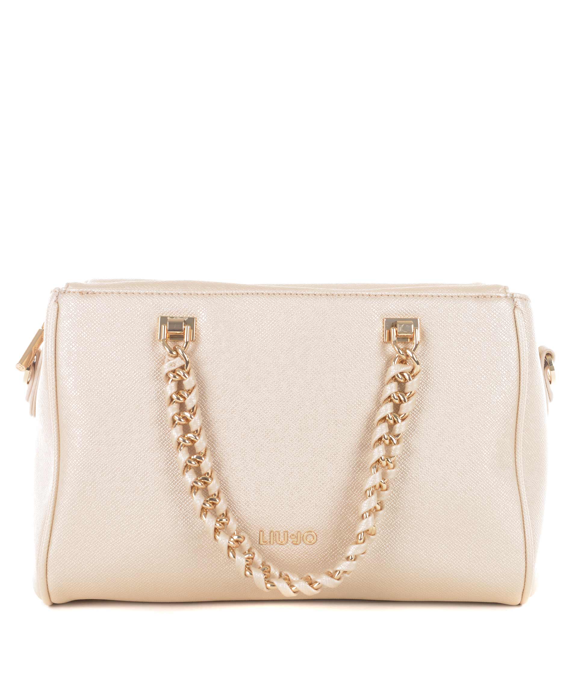 Bauletto Liu.Jo in ecopelle stampa saffiano Oro. Due manici morbidi a catena con inserti in ecopelle. Tracolla in ecopelle removibile e regolabile. Due tasche esterne con bottone a calamita. Apertura con zip. All'interno tasca con zip e tasche applicate. Foderata. Logo frontale in metallo dorato. Piedini metallici alla base.