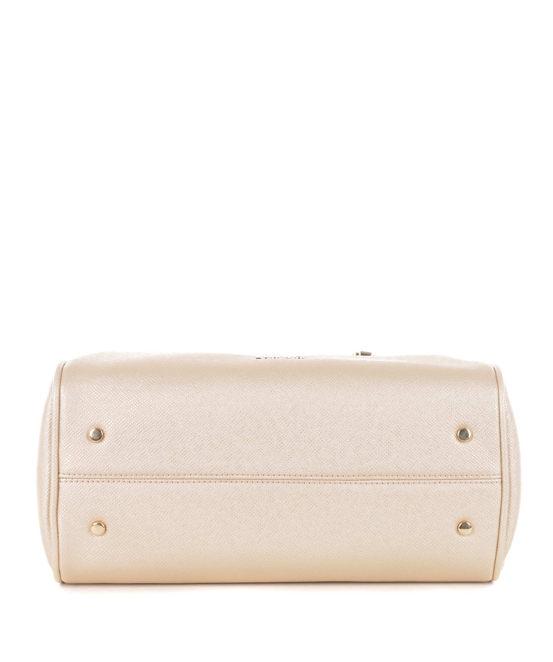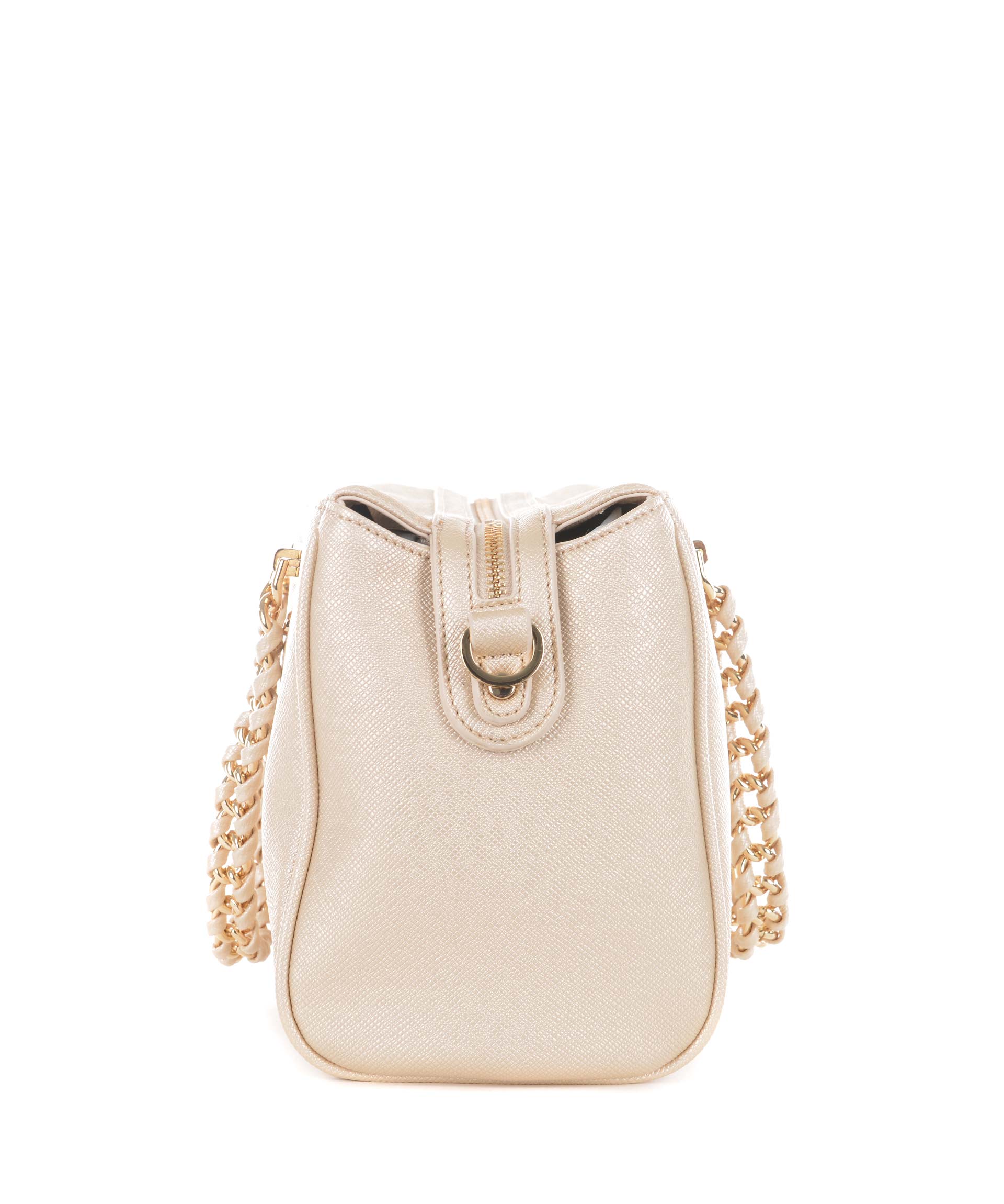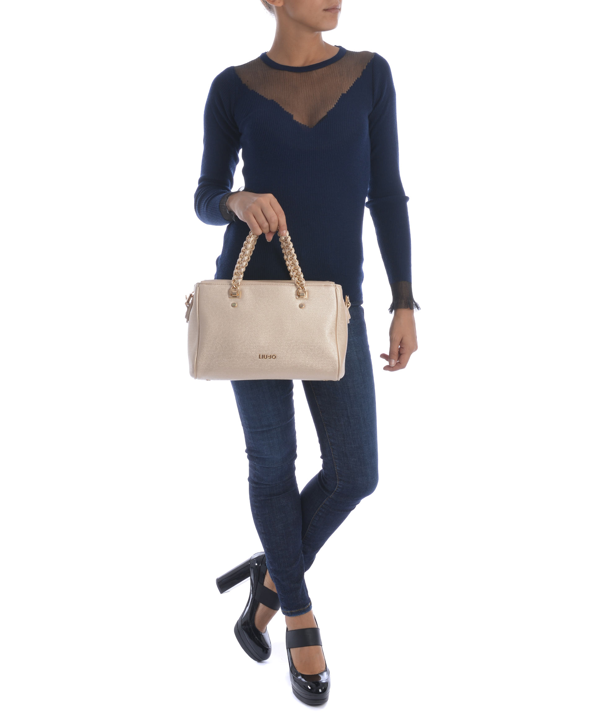 Bauletto Liu.Jo in ecopelle stampa saffiano Oro. Due manici morbidi a catena con inserti in ecopelle. Tracolla in ecopelle removibile e regolabile. Due tasche esterne con bottone a calamita. Apertura con zip. All'interno tasca con zip e tasche applicate. Foderata. Logo frontale in metallo dorato. Piedini metallici alla base.