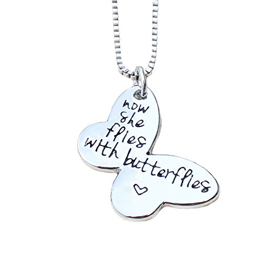 BEAUTIFUL & ELEGANT: Our one-of-a-kind, 18k white gold plated unique silver tone charm pendant loss quote engraved message text : Now She Flies With Butterflies» inspirational necklace is fashionable, trendy and matches everything you wear! The necklace will give you confidence, when you don't have any confidence in yourself. Not only that, but it won't tarnish or turn colors and it doesn't need regular polishing like 925 Sterling Silver.