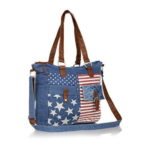-. Feature : Distressed denim styling, captures the look and feel of faded blue jeans / Featuring stars and stripes in classic red and white, with fun distressed patchwork detail / Double handled; shoulder strap extra-long and adjustable - in soft faux leather / Full zipper top, 2 exterior front pockets that snap closed, silver tone brushed metal studs and hardware / Purse measures 16 inches high by 13 inches wide