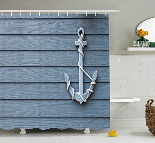 Nautical Decor Shower Curtain by Ambesonne, Anchor with Marine Rope on Wood Background Sea Ocean Life Coast Cruise Theme, Fabric Bathroom Decor Set with Hooks, 75 Inches Long, Blue Grey