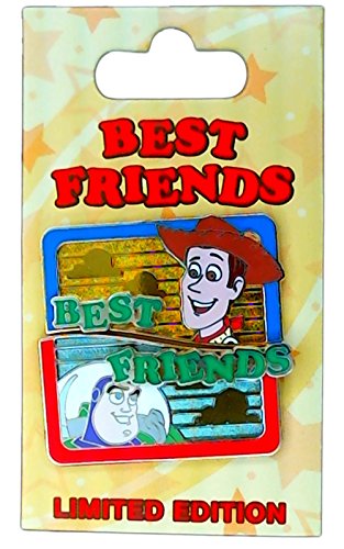 - This Best Friends pin-of-the-month is a double pin showing Toy Story character Woody on the top with the word "Best" next to him. Buzz is on the bottom with the words "Friends" over him.