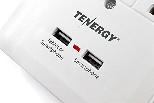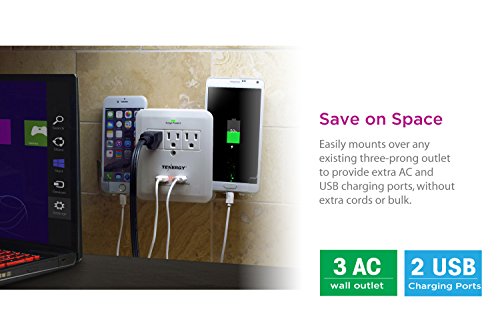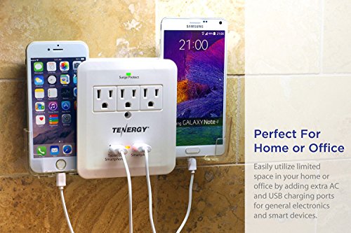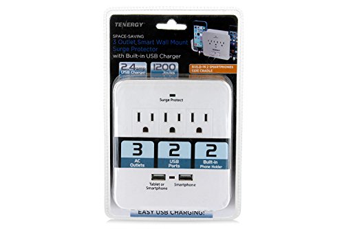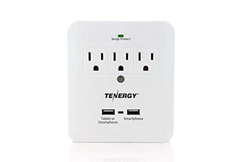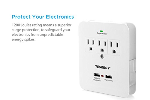 The Tenergy 3-Outlet Surge Protector is perfect for the electronics in your home or office. It easily mounts to an existing wall outlet to provide additional three prong outlets, and two USB chargers, while saving on space. With three AC outlets all performing with a 1200 Joules energy rating, it will protect your electronics from energy spikes that can cause permanent damage to your devices.