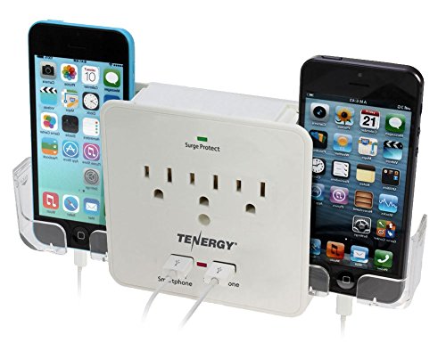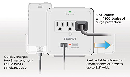 Tenergy 3 AC Outlet Wall Mount 1200 Joules Surge Protector w/ 2.4A Dual USB Charging Port & Retractable Phone Holder for Smartphones - Perfect for Home & Office - UL Listed
