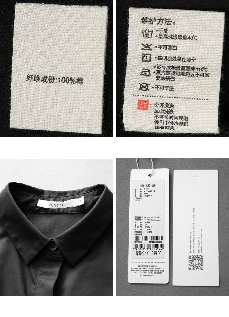 | 洗涤标准: | 不可漂白40℃以下手洗悬挂晾干不可浸泡不可干洗110℃以下垫布熨烫 |