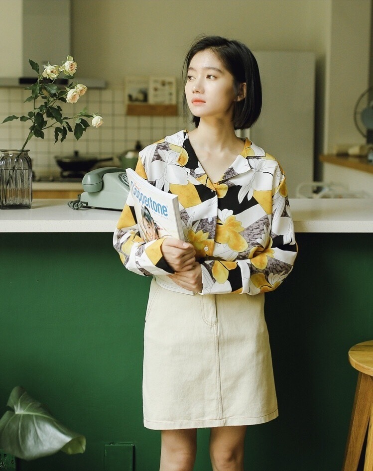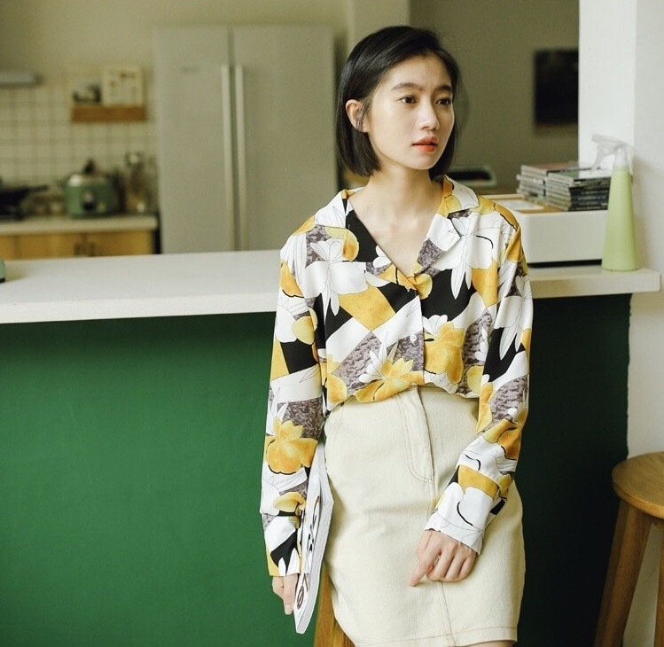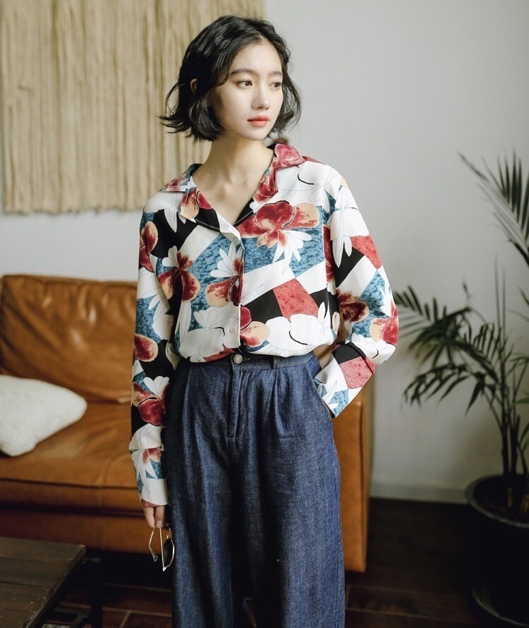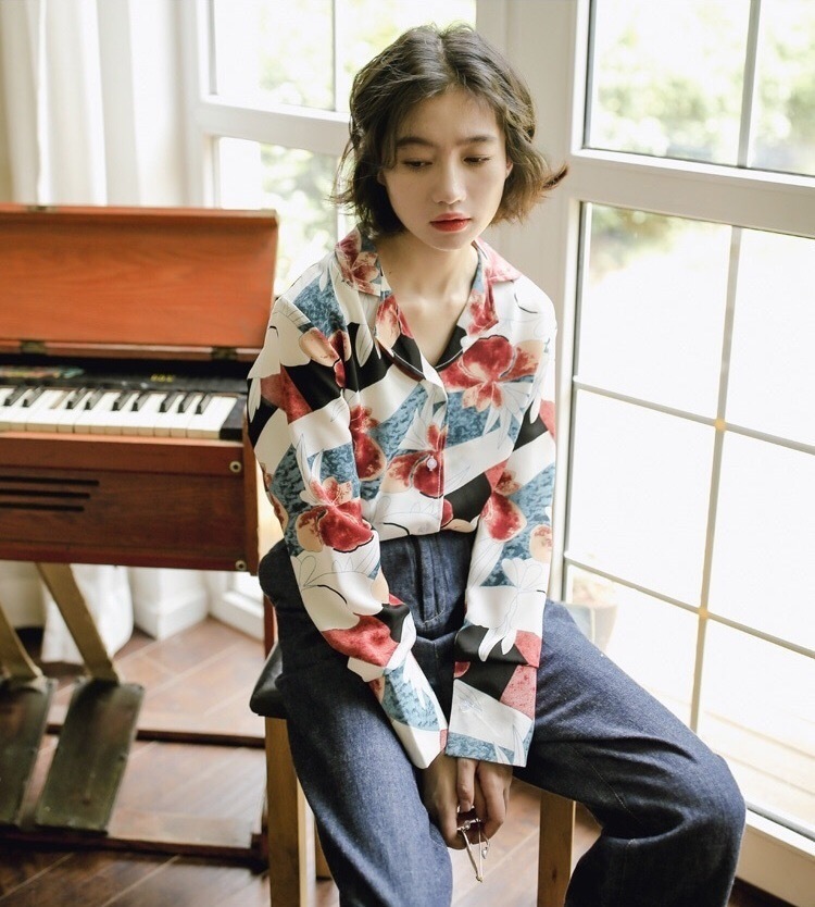 大きな花柄が目を引く大人っぽい雰囲気の長袖シフォンシャツです。