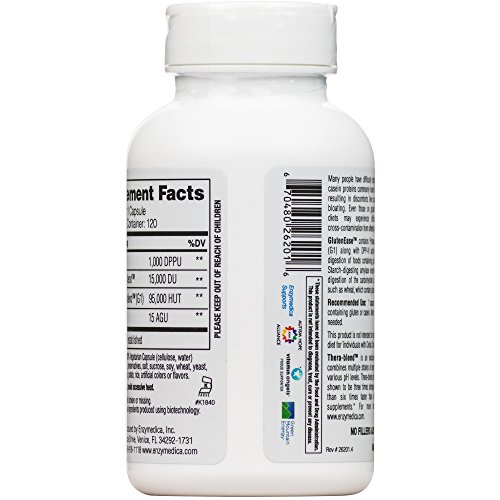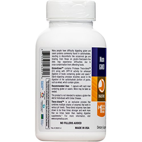 Enzymedica's GlutenEase contains a unique combination of proteases for digesting gluten and casein. Proteases high in DPP-IV activity assist in breaking down gluten and gliadin proteins which may reduce the onset of symptoms associated with intolerance. This proactively supports the gut, allowing proteins to be properly broken down and absorbed in their digested state; broadening the potential food groups a person may eat. GlutenEase may also be used by those who wish to remain on the GFCF diet to ensure complete breakdown of proteins safe and effectively. GlutenEase addresses a related issue that also stems from gluten intolerance; problems digesting the carbohydrates of offending foods. Research has also found that gluten is a protein and carbohydrate fraction. For this reason, GlutenEase also contains Amylase Thera-Blend? and Glucoamylase. Amylase and glucoamylase enzymes assist in the digestion of the carbohydrate portion of grains (such as wheat) which often contain gluten. Glucoamylase is necessary to finish the digestion of those sugar and starch molecules to glucose, the simplest sugar used by the body for energy.Feature