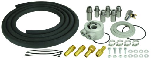 - Engine Oil Cooler kit includes universal thermostatic sandwich adapter and adapter plate, 13/16-16 inch, 3/4-16 inch, 18mm, 20mm, and 22mm sleeve nuts, 180°F In-line thermostat, 10 ft of 1/2 inch OEM spec hose, and mounting hardware