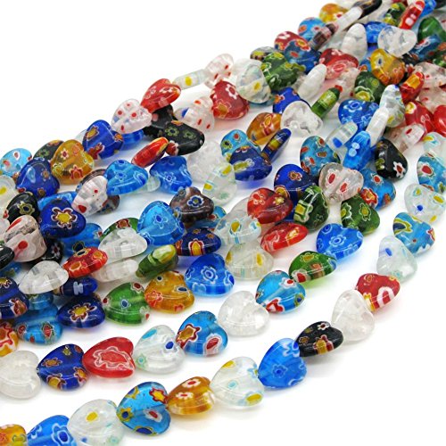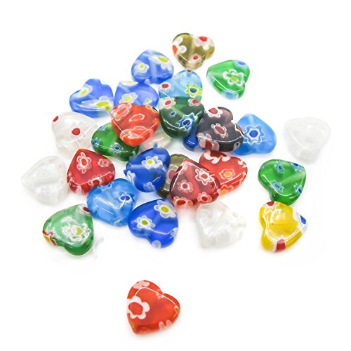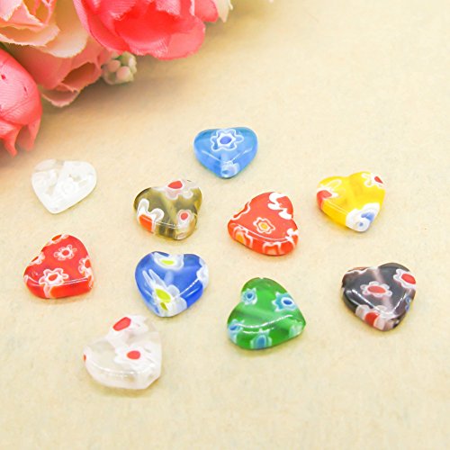 Beading Station 40-Piece Mix Millefiori Lampwork Flat Heart Glass Beads, 10mm