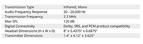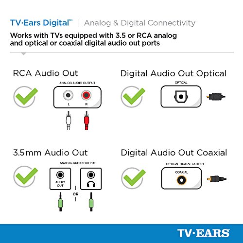 Works on Any TV including Plasma and LCD Televisions, Digital connectivity with Dolby, SRS, and PCM compatibility, works with TV volume at any level, including muted, comes with TV Ears Slide tips on headset for added clarity and comfort, 125 decibels of power and 3 times more powerful than other headsets, changes 2 headsets at once, ultra light weight headset-2 oz.Feature