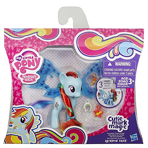 -. Binding : Toy -. Brand : My Little Pony -. EAN : 0885324032230 -. Feature : Winged pony figure looks like Rainbow Dash / Figure's beautiful wings are glittery / Comes with 3 charms / Share charms with other ponies (other figures sold separately) / Includes pony figure, wings and charms -. IsAdultProduct : 0 -. Label : My Little Pony -. Manufacturer : My Little Pony -. Model : B0671AS0 -. MPN : B0671AS0 -. PackageQuantity : 1 -. PartNumber : B0671AS0 -. ProductGroup : Toy -. ProductTypeName : TOYS_AND_GAMES -. Publisher : My Little Pony -. Studio : My Little Pony -. Title : My Little Pony Cutie Mark Magic Friendship Charm Wings Rainbow Dash Figure -. UPC : 885659151835 -. Warranty : No Warranty