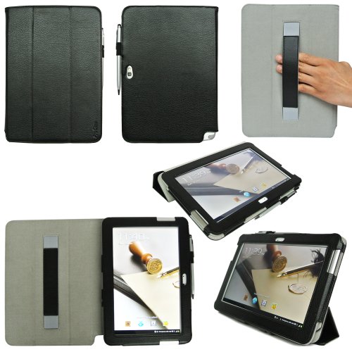Built-in Tri-Fold front lid easily fold back as a stand with multiple viewing angles (typing and watching); Built-in elastic hand strap for one-hand viewing, built-in elastic loop for pen or stylus (Stylus NOT included)