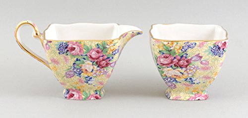 Product Description This ROYAL WINTON - Welback Ascot chintz sugar/creamer set is a collector piece. The set is no longer made and with limited editions. This NEW set is from the 1995 edition. The "Welbeck Ascot" chintz pattern has more than 10 beautiful colors detailed throughout the decor. The set is imported from England. The gold trim and scalloped edges adds to the beauty of this wonderful collector's set. Hand wash is recommended with a non-abrasive cloth. The creamer measures approximately 2.5" tall by 4.75" wide - the sugar bowl is approximately 2.38" x 2.78". 0
