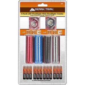 6 Pack LED Aluminum Flashlight and Headlight Combo with 12 AAA and 4 Cell Button Batteries, 6-18 Lumens