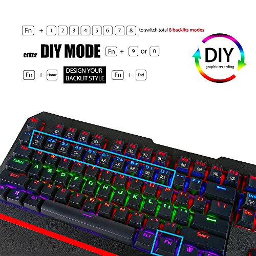 -. Binding : Personal Computers -. Brand : Redragon -. Color : Black -. EAN : 6959011595767 -. Feature : Custom DIY Graphic Recording:Player can design LED backlight graphic via FN+9 and 0. Firstly, player has to press fn+9 or 0, and then player should press fn+home. The keyboard backlight graphic can be reset by players. / ANTI-GHOSTING 104 KEYS RGB mechanical keyboard. N-KEY ROLLOVER: it allows player simultaneously operate multiple keys. The mechanical keyboard is constructed with floating keys, blue switches (OUTEMU switch). It gives player high-grade games experience with fast response. Excellent water and Dust Proof with 104 floating keys. Water-resistant with five drain holes. / Amazing typing background color: K558 comes with 8 different backlight gaming models. Player can alter different gaming light model via FN+ "1"to"9"to realize it. Lock / unlock function for WINDOWS key to avoid miss clicks / distractions during gaming. / Redragon mechanical gaming keyboard comes with blue switch and ultra-long working durability, Ergonomic design fits for all gamers. -. HardwarePlatform : PC -. Label : Redragon -. Manufacturer : Redragon -. Model : K558 -. MPN : K558 ANALA -. PackageQuantity : 1 -. PartNumber : K558 ANALA -. ProductGroup : Personal Computer -. ProductTypeName : KEYBOARDS -. Publisher : Redragon -. Studio : Redragon -. Title : Redragon K558 ANALA RGB Mechanical Gaming Keyboard (LED Multiple Color Backlit)