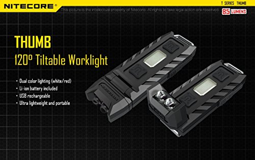 Studio : Nitecore Publisher : Nitecore Binding : Misc. Product Description The Nitecore Thumb is an awesome everyday carry work light that can clip on your pocket for easy carrying. It has a 120° adjustable head so you can be sure to illuminate exactly where you need to. With 85 lumens, the Thumb illuminates your entire field of vision, eliminating any dead spots. It features three brightness levels and a flashing mode that can be used as a location beacon in case of emergencies. With both a white LED and red LED, the Thumb can be used in all kinds of situations. It features a dual switch to operate both the white LED and the red LED allowing you to easily choose which LED is best for you at the moment. The Thumb is USB rechargeable and features a charging indicator so you know when the flashlight is fully charged. The Thumb has an intelligent protective circuit that protects from over-discharge, over-charge, short-circuit, and automatically stops charging when the battery is full. Its casing is made from polycarbonate materials making it incredibly strong and impact resistant. Included Accessories: rechargeable battery pack, key ring, and mini USB light Features: Equipped with a white LED and red LED delivering up to 85 lumens Features two switches Has a 120° adjustable head Has three brightness levels and a flashing mode that can be used as a location beacon High (85 lumens) - 45 minute runtime Medium (30 lumens) - 2.25 hour runtime Low (2 lumens) - 22 hour runtime USB rechargeable Has a charging indicator Has an intelligent protective circuit that protects from over-discharge, over-charge, short-circuit, and automatically stops charging when the battery is full Made from polycarbonate materials Impact resistant up to 1.5 meters Water resistant up to IP65 standards Nitecore 5 year warranty Dimensions: 74mm (length) x 24mm (head diameter) Net weight: 0.88 oz (without batteries) 0