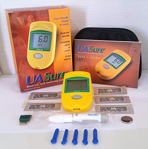 Studio : Apex Publisher : Apex Binding : Health and Beauty Product Description NEW UA Sure, Blood Uric Acid Monitoring System. The UASure Blood Uric Acid Monitoring System, employing advanced biosensor technology, is a unique hand-held system for both healthcare and individual users with the convenience of a portable device and easy operation for blood uric acid self monitoring. Specification Measurement Range : 3 - 20 mg/dL、(1.1 ~ 33.3 mmol/L) Sample Volume (μL) : 3 μL Testing Time (seconds) : 30 seconds. Operating Temperature (°C) : 10°C to 40°C KIT CONTENTS One Test Meter, 5 Pcs.Uric Acid Test strips,one Lancing Device 5 Lancets, 1 CR2032 Battery. Soft Case and Instruction Manual in English. 0
