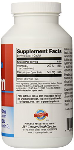 -. Binding : Health and Beauty -. Brand : 21st Century -. EAN : 0785923406756 -. Feature : Compare active ingredients to Os-Cal calcium plus D3 / Support for bone health / 500mg calcium and 200 IU vitamin D3 in each easy to swallow caplet / No added sugar, yeast, preservatives or artificial flavors / Gluten free -. IsAdultProduct : 0 -. Label : 21st Century -. Manufacturer : 21st Century -. MPN : na -. NumberOfItems : 1 -. PackageQuantity : 1 -. PartNumber : na -. ProductGroup : Health and Beauty -. ProductTypeName : HEALTH_PERSONAL_CARE -. PublicationDate : 2013-12-09 -. Publisher : 21st Century -. ReleaseDate : 2013-12-06 -. Studio : 21st Century -. Title : 21st Century Calcium 500 Plus D Caplets, 400 Count -. UPC : 740985275238