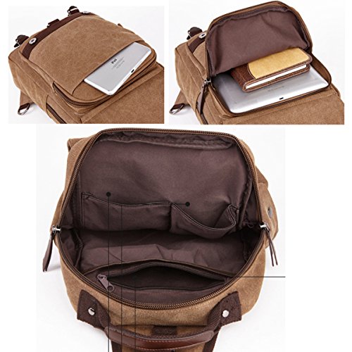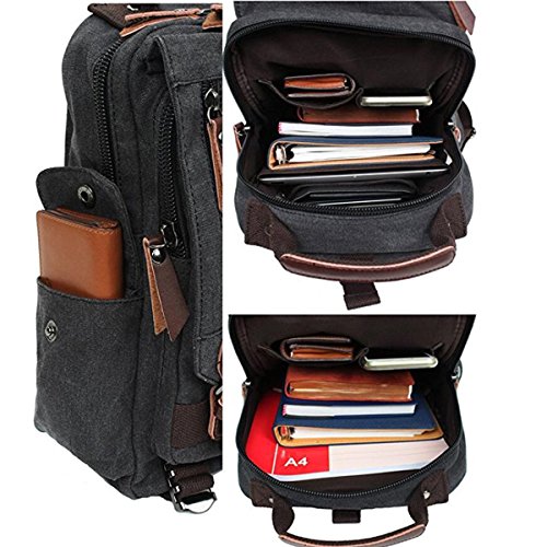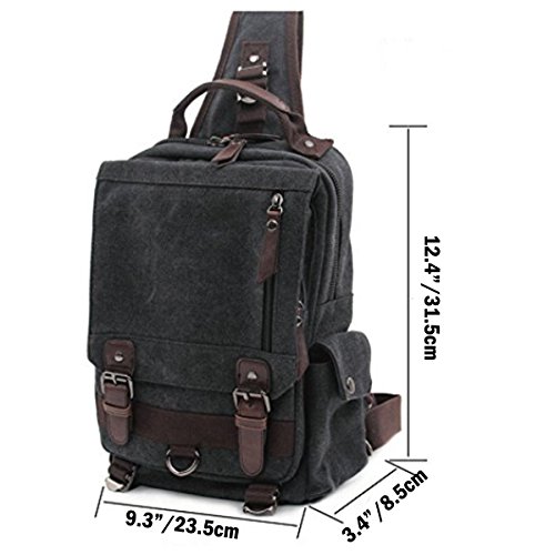 -. Feature : Material: Soft and durable Washed Canvas with PU Leather Decoration. The messenger sling bag is made of a very durable looking canvas material on the outside and a softer, more luxurious material inside the main compartment. NOTE: We have updated the tag, two tags are randomly sent. We appreciate your understanding. / Size: 9.3*12.4*3.4 in (L*H*W). The shoulder bag can fit a 10" tablet. This canvas backpack is a mini backpack, but it is a great size to take to a day trip or shopping. The bag can be either carried with the hand handle or adjustable shoulder strap. Weight: approx. 770g. The full length of the strap: approx. 41in. / The canvas backpack is vintage and multifunctional with lots of pockets. 1 zipper pocket is in the front flap; 1 zipper pocket and 1 open pocket are under the flap; 2 side pockets. The main compartment is fitted with two zip heads and pulls: 1 inner zipper pocket; 1 inner laptop pocket; 2 inner small pockets. A small laptop, iPhone, wallet, snacks, tickets and magazine will all fit comfortably with room left over for add-ons. / The buckles on the top flap open and close easily and keep everything very secure. The zipper pocket on the top flap can put tickets and passport for easy access. The strap is adjustable and ultra-comfortable across your back and chest. It can act as a single-shoulder bag/sling bag, or a cross-body bag for use. / Stylish, Unisex and Effective: It is a nice little bag for school, college, working, dating, shopping and traveling in daily life. Although it is not waterproof, it can also be carried for outdoor activities, such as running, cycling, camping, etc. It is a great gift for your friends and family.