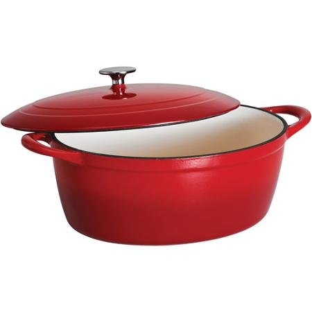 -. Brand : Tramontina -. Color : Red -. EAN : 0715877286944 -. Feature : Cast iron construction Capacity: 7-qt Dutch oven / External porcelain enamel finish is durable and scratch-proof / Off-white porcelain enamel interior finish Stainless steel knob / Compatible with gas, electric, ceramic and induction cooktops / Oven-safe up to 450 degrees F Hand-wash only -. Label : Tramontina -. Manufacturer : Tramontina -. ProductGroup : Kitchen -. ProductTypeName : KITCHEN -. Publisher : Tramontina -. Size : (L x W x H): 14.25 x 6.38 x 13.12 IN -. Studio : Tramontina -. Title : Color Red Gourmet 7-Quart Cast Iron Covered Oval Dutch Oven -. UPC : 715877286944