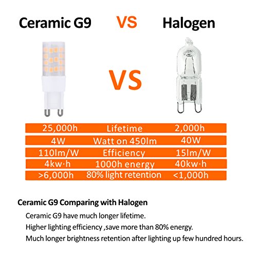 - Energy efficient, 92% less energy used,g9 led bulb 40-50w halogen equivalent with only 4.5W LED, over 10 times longer lifetime than halogen