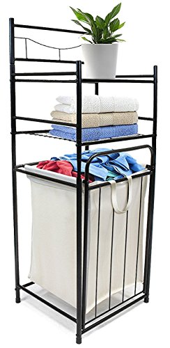 - BATHROOM TOWER HAMPER — Provides storage and display with 2-tier shelf and tilt laundry hamper for easy access — Conveniently store household items for the bathroom, laundry room, closet, or anywhere storage is needed