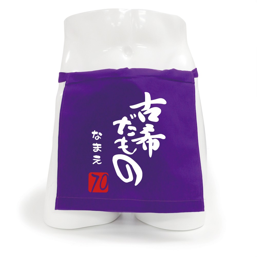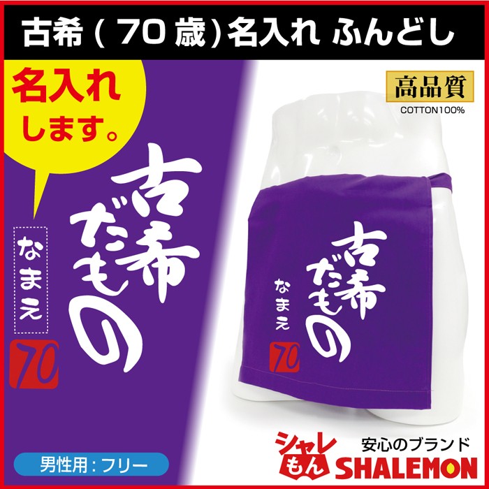 古希祝い 男性用 下着 名入れ ふんどし です。実用性ある古希祝いです。紫ふんどしに“古希だもの”というユニークデザインが人気です。70歳の数字朱印の上に8文字まで名入れも可能です。名入れはひらがなの文字がデザインにあっていてGood!※書体は ひらがな のみ、だものフォントになります。文字色は白色です。   名入れ文字は漢字の指定も可能ですが、ひらがな以外は明朝体に変換されます。
