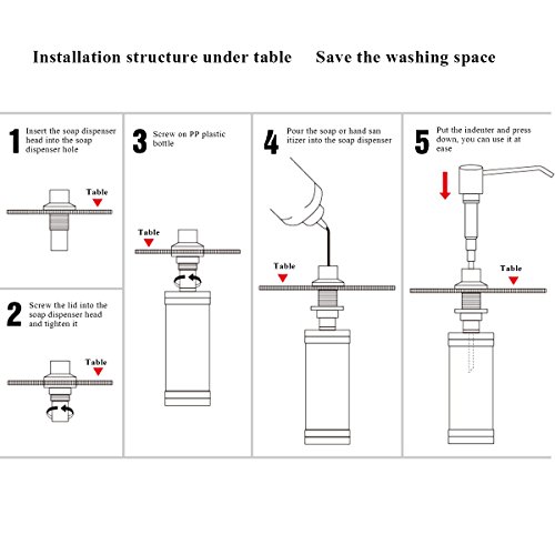 - ❤INSTRUCTIONS: Remove lock nut,leaving washer on the threaded flange;Insert flat end of pump tube into pump;Insure washer is centered beneath flange.Insert threaded flange through the hole on the tabletop;From underneath sink hand tighten the lock nut to secure flange and thread on the bottle.