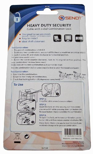 The Sendt combination lock security cable is easy to install and an ideal theft deterrent. In addition to securing a notebook or laptop, it may be used with a netbook, LCD screen, plasma screen, projector and will fit any device that has a Kensington compatible security slot.