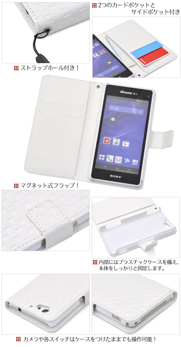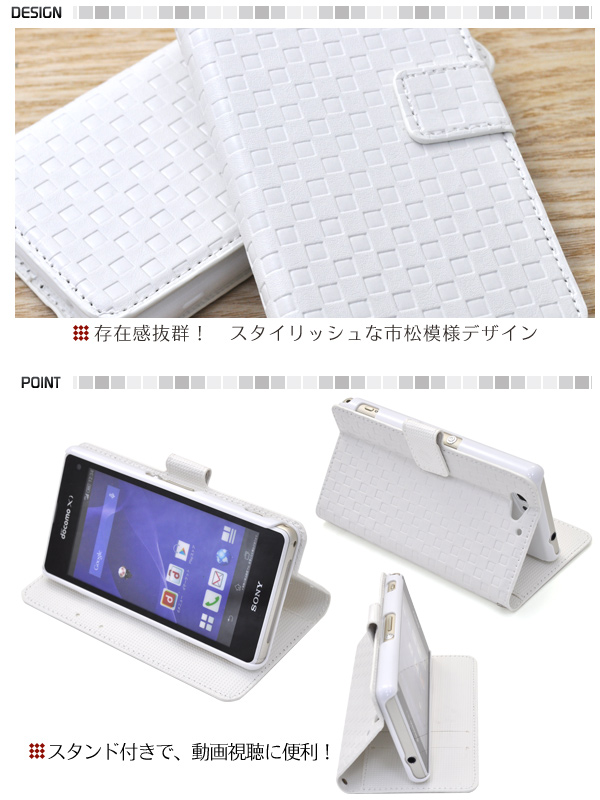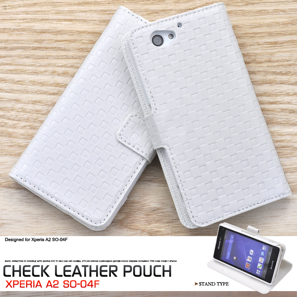 市松模様レザーデザインのXperia A2 SO-04F?/ Xperia J1 Compact用スタンドケースポーチ。