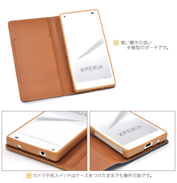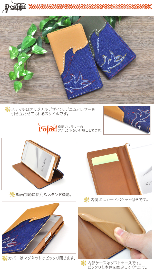| |  |  | |  | | 製品仕様 | | 対応機種 | Xperia Z5 Compact SO-02H | | 素材 | 合皮、TPU、デニム | | 注意事項 | ※本製品はマグネットを使用しておりますのでクレジットカードなどの磁気カードの収納は避け、 カードの注意事項をよくご確認の上ご使用ください。 読み取り等ができなくなる恐れがあります。 ※本製品に収納された、カードのデータ等が喪失された場合におきましても、当社では一切保証致しかねます。 ※長時間接触していたり、強い力で擦れるとスマートフォンに色移りする場合がございます。 ※本製品をスマートフォンに装着する際には本体や本製品に付着したゴミやホコリをよく取り除いてください。ホコリ等がついたまま装着すると、スマートフォンに傷がつく恐れがあります。 ※本製品は強い衝撃からスマートフォンを保護することは出来ません。 |