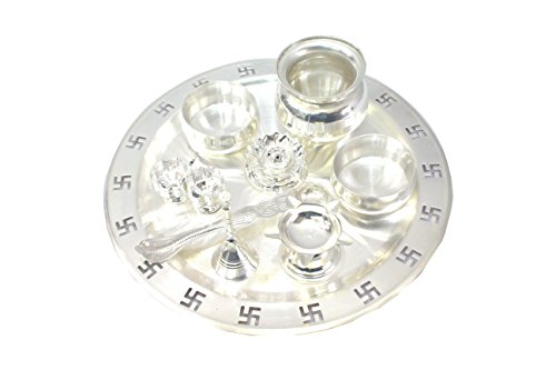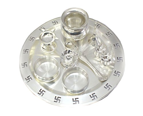 The Pooja Thali Set in German Silver consists of an intricately designed Pooja plate, as well as, an assortment of their items necessary for performing various religious rites during auspicious occasions