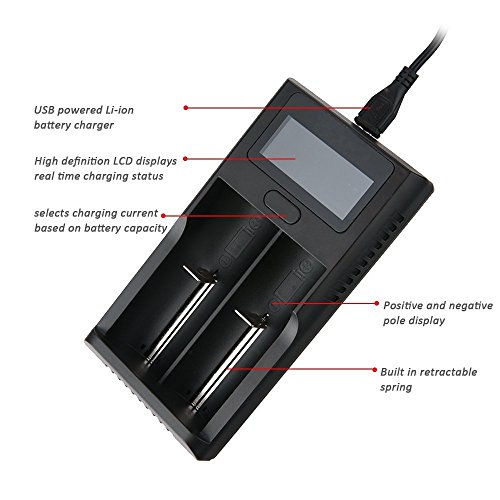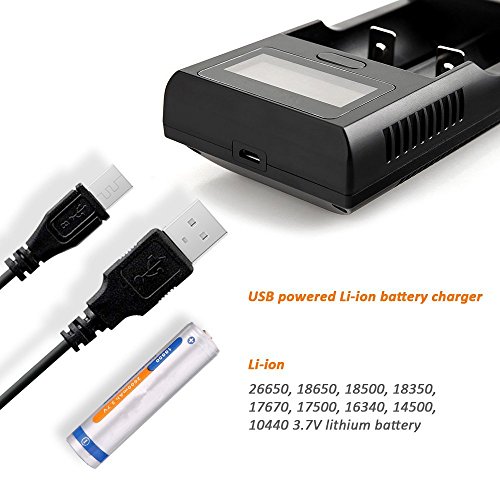 2-Bay Smart Li-ion Battery Charger, for 18650, 26650, 18500, 17335, 3.7V AA, AAA Rechargeable Lithium Batteries, Flashlight Torch headlamp Charger, USB Port Dual Channel with LCD
