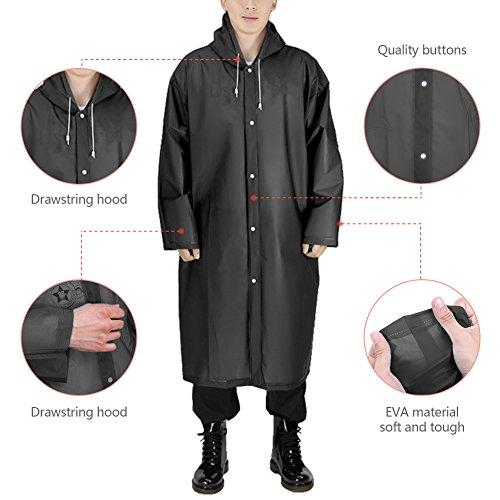 -. Feature : Waterproof: Welded seams poncho with drawstring hood and sleeves,keep you and your backpack dry. / Unisex Poncho: One size fits most, perfect for both men and women. 6colors available.Package:2pcs. / Material: Made of 0.15mm thicker EVA,an enviromentally friendly material,non-toxic,no smell and harmless. / Emergency Poncho: Lightweight and foldable in small size,just keep it in your backpack for emergency. / Multiple Use: Suitable for theme parks,disney land,rainy days,water rides,site seeing,dog walkers,camping and hiking,traveling,etc.