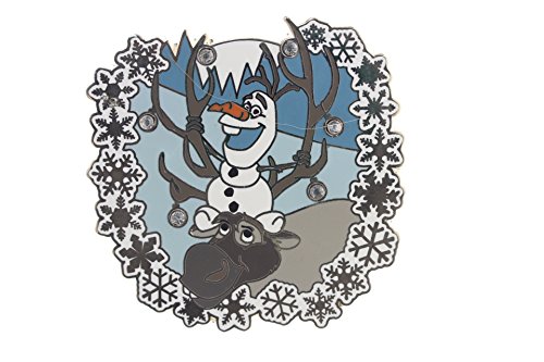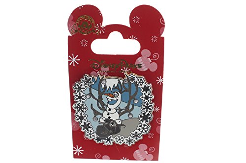 Binding : Apparel Product Description Sven and Olaf holiday season pin. Olaf is sitting on top of Sven with the woods in the background and the pin is encircled by snowflakes. Sven's antlers are adorned with jeweled ornaments. The characters on this pin are from the movie Frozen. 0