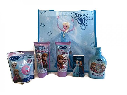 -. Binding : Misc. -. Brand : Disney -. EAN : 0729224636818 -. Feature : Frosted Berry scents: body lotion, shampoo, hand soap / Color twist bath bomb / 1 pack tissue / 6 piece bath and body set / Gift Tote Bag. Make a great gift! -. IsAdultProduct : 0 -. Label : Disney -. Manufacturer : Disney -. MPN : 1234 -. PackageQuantity : 6 -. PartNumber : 1234 -. ProductGroup : Beauty -. ProductTypeName : BEAUTY -. Publisher : Disney -. Studio : Disney -. Title : Disney Frozen Anna Elsa Bath and Body Set with Gift Tote Bag -. UPC : 729224636818
