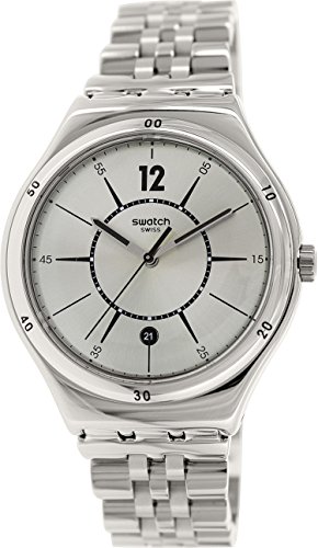 Studio : Swatch Publisher : Swatch Binding : Watch Product Description Upgrade any outfit with this casual timepiece by Swatch Showcasing a trendy 40mm silver stainless steel case and silver stainless steel band this watch allows you to show off some design without having to try This watch also displays an eye-catching silver dial with blue details making this a must-have watch with a lot to offer Additional features include an arabic numeral display water resistance up to 30 meters date display and measures seconds 0